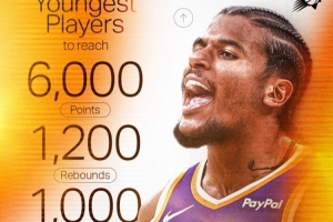 体育资讯7月11日讯 太阳官方晒出一张关于“拿到6000分+1200篮板+1000助攻最年轻的8位球员”数据图,并配文写到:“跻身顶级行列。”