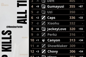 体育资讯11月1日讯 外媒统计全球总决赛总击杀数榜单,具体如下:
