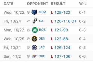 体育资讯11月3日讯 鹈鹕客场106-137惨败雷霆,遭遇开季6连败。