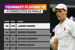 据Opta统计,辛纳是公开赛时代连续4次晋级大满贯男单决赛最年轻的选手。