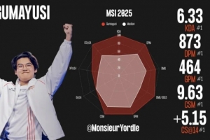 体育资讯7月12日讯 2025MSI T1 vs AL败者组决赛赛前,外网数据博主更新Gumayusi选手本次MSI数据,KDA、分均伤害、分均经济、分均补刀、14分钟补刀领先均位居第一。