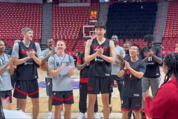 开拓者公关团队的成员Maggie Yang今天过生日,杨瀚森领头用中文为她(华人)唱生日快乐歌