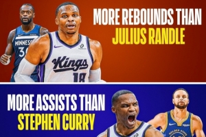 威少目前场均得分高于小萨(15.0>14.5)、场均篮板高于兰德尔 (7.1>6.9)、助攻比库里多(5.6>4.3)