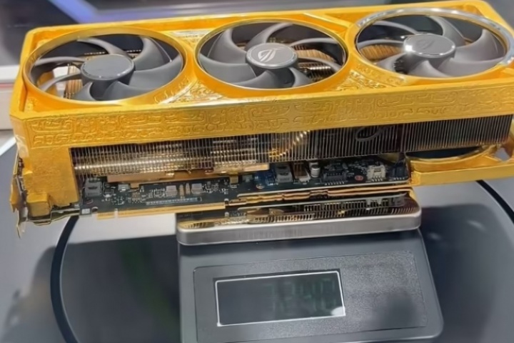 该显卡总重达 7240g,其中 5kg 为由 24K 纯金打造的主题花纹框架、护盖、背板。目前国内纯金价格在 770 元 / 克左右,而饰品金价已突破千元每克大关,按后者计算这张显卡的物料价格即超 500 万元。
