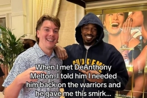 被问到是否回勇士时,梅尔顿只是笑笑没有回答。之后梅尔顿与两位球迷合影留念。