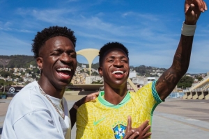 体育资讯7月18日讯 巴西球星维尼修斯更新社交媒体动态,他晒出与自己蜡像的合影。