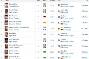 阿森纳队史引援转会费排行前十(单位:欧元/数据来源德转):