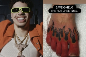 这个纹身是纹在脚背、脚趾背部相连处,然后是一个火焰图案。纹身师还配文:"给拉梅洛做了个‘火辣芝士脚趾’纹身。"
