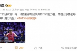 体育资讯7月28日讯 乒超联赛结束第二阶段争夺,王曼昱发文总结了第二阶段比赛,并对队友表示了感谢。