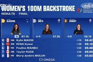 体育资讯7月29日讯 2025新加坡世界泳联世锦赛,女子100米仰泳决赛,麦基翁57秒16打破赛会纪录夺冠,雷根-史密斯获得银牌,彭旭玮59秒10刷新PB,最终排名第五。