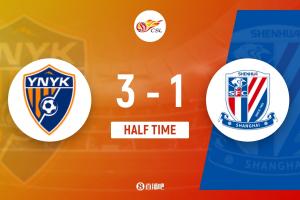申花扳回一城!高天意任意球破门!第45+6分钟,高天意主罚任意球直接射门,皮球转向球门远角,余鉴贤反应不及,云南玉昆3-1上海申花!↓