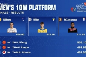 澳大利亚选手鲁索以515.20分夺得冠军,塞里达和维拉斯获得银牌和铜牌。中国选手朱子锋506.10分排名第四,14岁小将赵仁杰排名第5,中国跳水队历史首次无缘男子单人10米台大赛领奖台。