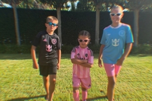瓦尔迪的妻子社媒晒出三个孩子的照片,孩子们都身穿迈阿密国际球衣。