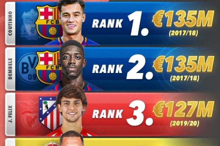 体育资讯08月07日讯 外媒SCORE90列出了西甲历史上引援最贵的前五名排行,库蒂尼奥和登贝莱以1.35亿欧元的转会费并列第一。