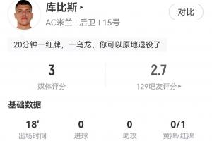 上半场,米兰首发的21岁中卫库比斯先是在定位球防守中不慎乌龙,随后又作为最后一名球员拉倒若昂-佩德罗,被出示直红罚出场外,使球队被迫陷入十人作战的情况。此外,球队第2个丢球中他也犯了盯人不紧的错误。