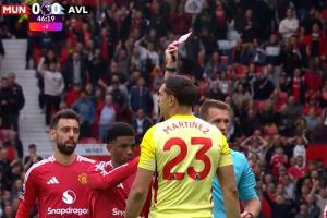 24/25赛季英超最后一轮,曼联2-0十人维拉,上半场补时阶段,卡什回传送礼,大马丁出击踢翻单刀的霍伊伦,被主裁判直红罚下。