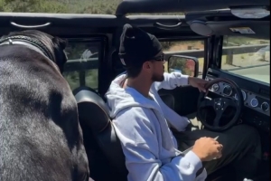 体育资讯8月19日讯 近日单身的太阳队球星德文-布克驾驶悍马出游,狗狗陪伴在他的身边。