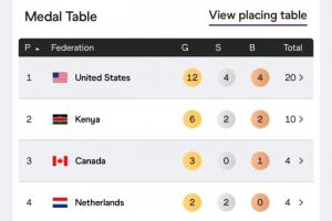 最新的世锦赛奖牌榜,美国12金4银4铜继续高居榜首,肯尼亚6金2银2铜第二。中国在女子链球(赵杰和张家乐)斩获1银1铜、在男子跳远(石雨豪)斩获铜牌、在男子20公里竞走(王朝朝)斩获银牌,2银2铜4块奖牌排第20。亚洲国家中,巴林1银1铜、韩国1银、东道主日本2铜、卡塔尔1铜上榜。