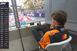 体育资讯09月21日讯 F1阿塞拜疆大奖赛,皮亚斯特里退赛后坐在赛道旁用手机看比赛。
