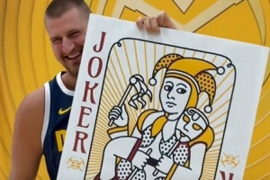 拍摄现场,约基奇先后手拿迷你扑克牌和超大扑克牌,掘金官方配文:新赛季从“小王”进化为“大王”。