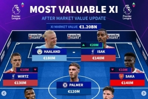 英超身价最贵阵:哈兰德、维尔茨、伊萨克在列,总身价12亿欧