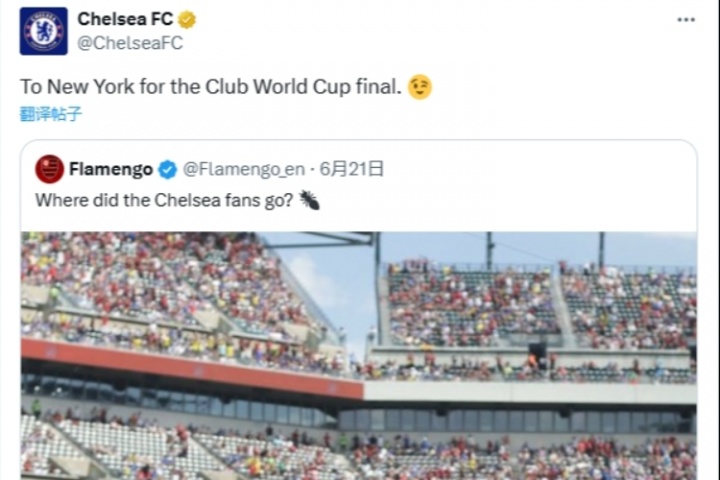 弗拉门戈小组赛3-战胜切尔西,当时他们球队社媒晒照嘲讽:“切尔西球迷们要去哪?”切尔西今天也在社媒转发回应:“去纽约参加世俱杯决赛😉。”