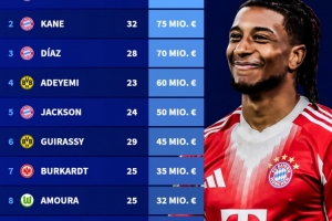 3、路易斯-迪亚斯(拜仁):7000万欧元